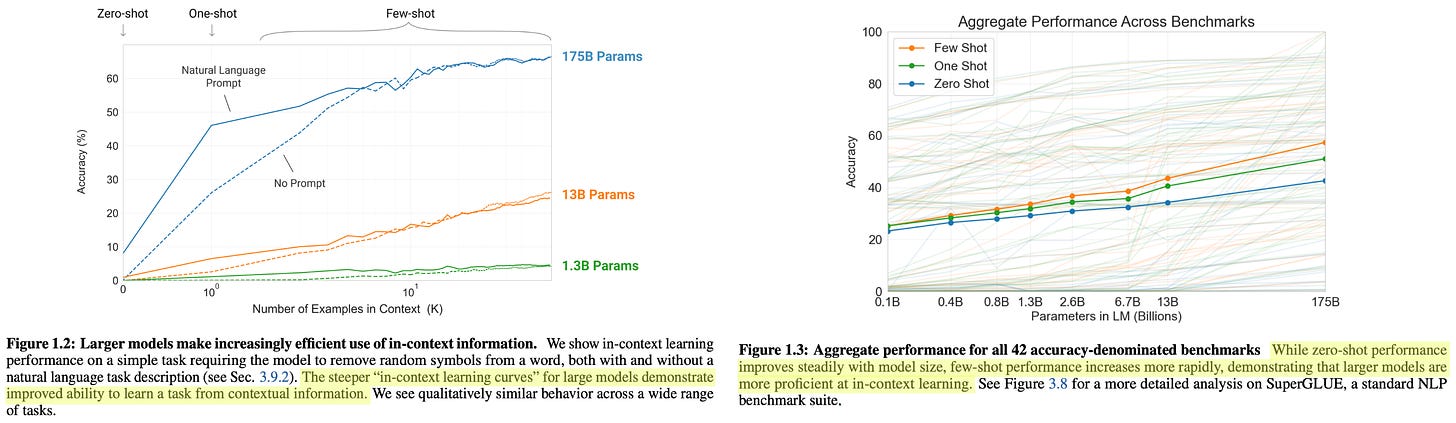少样本学习是一种新范式,其中大型语言模型(LLM)通过在其上下文窗口中放置的示例来学习如何执行任务。[4] 中的作者将这一概念称为“上下文学习”。在这种情况下,LLM 实际上并没有“学习”—— 模型的权重根本没有更新 。相反,模型输入中的示例被用作生成更准确输出的上下文。[4] 中我们看到,GPT-3 是一个高度有能力的少样本学习者,这似乎表明上下文学习是较大模型的一种涌现 9 能力;见下文。