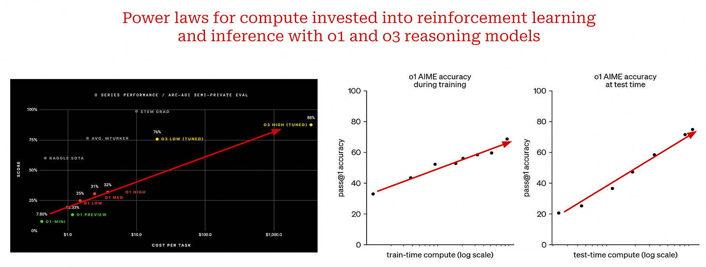 新的扩展范式。 在阅读了这篇概述后,许多由 o1 和 o3 提出的图表(见上图)可能看起来很熟悉—— 这些是对数刻度图,我们看到随着计算量的增加,性能呈现出平滑的线性增长 !换句话说,我们看到这些推理模型的性能与两个不同量之间存在明显的幂律关系:
