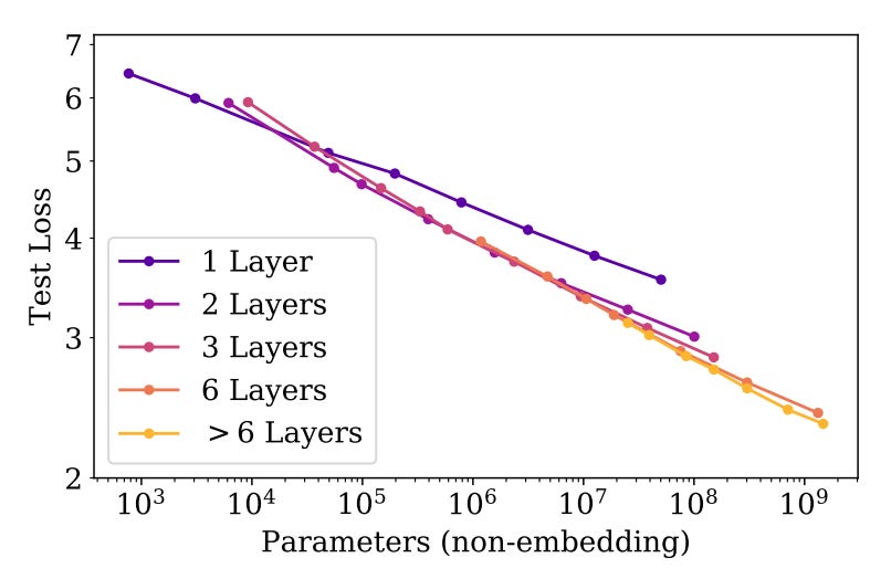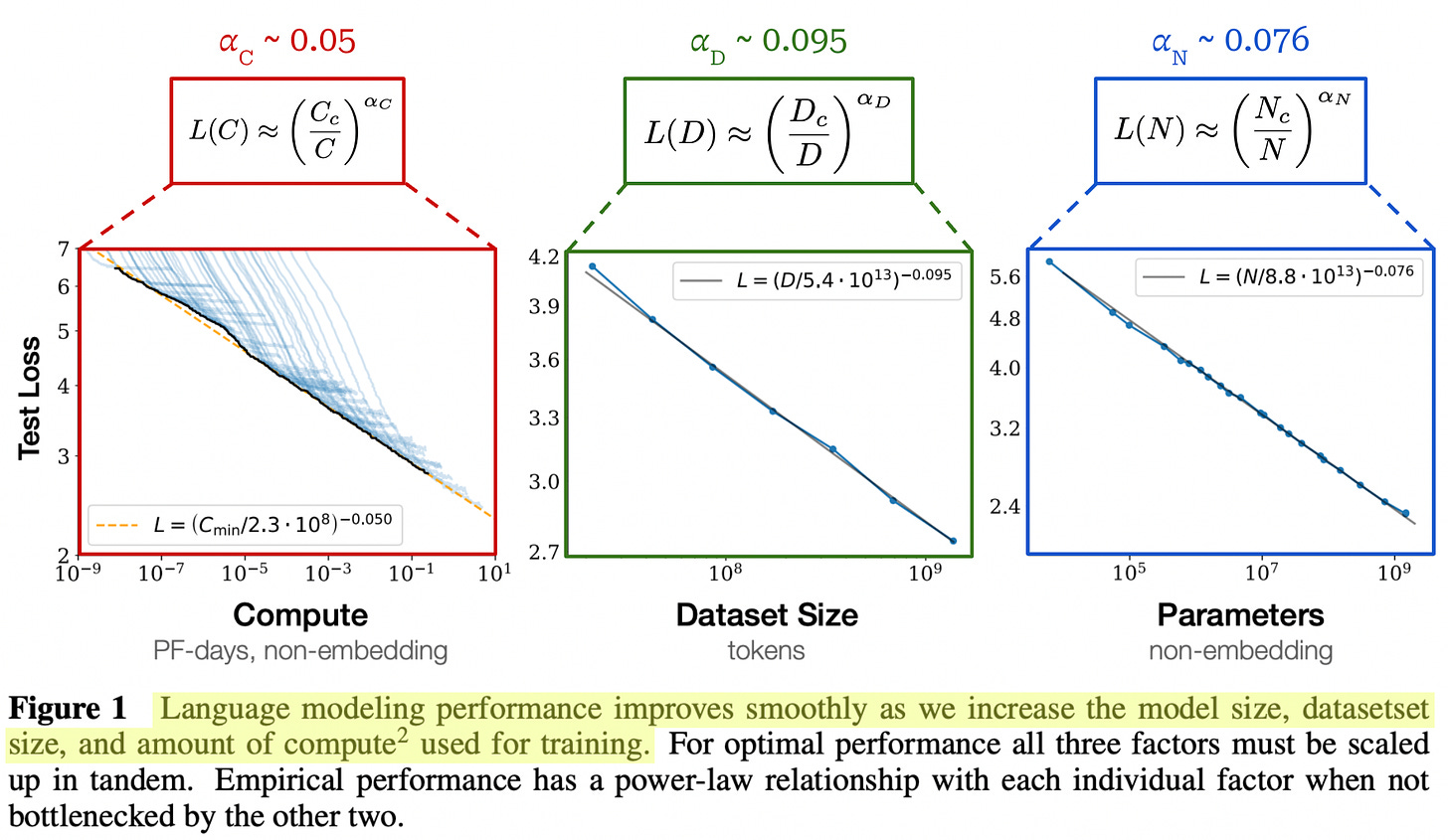 “损失随着模型大小、数据集大小和用于训练的计算量呈幂律缩放,某些趋势跨越了七个数量级。” - 来自 [1]