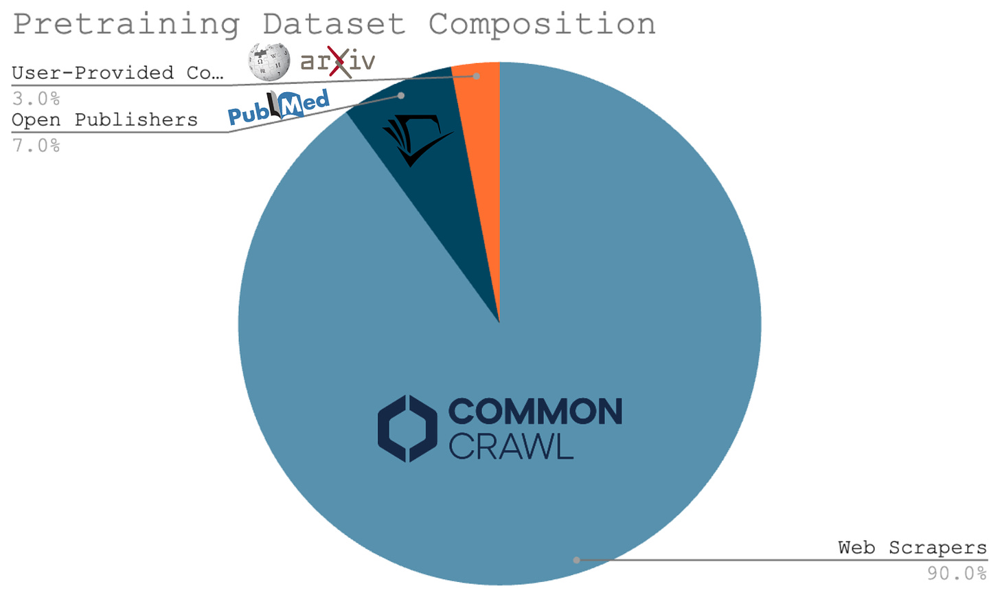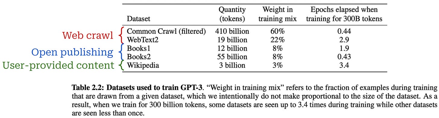 同样,GPT-3 使用的也是一种仅解码器的模型架构,这与之前的模型非常相似,但我们在一个更大的数据集上对模型进行了预训练,这个数据集基于 CommonCrawl 。这个数据集的规模大约是之前 WebText 数据集的 10 倍,[4] 中的作者将更大的预训练数据集与其他几个预训练数据源结合,创建了一个不同语料库的混合体;见下文。