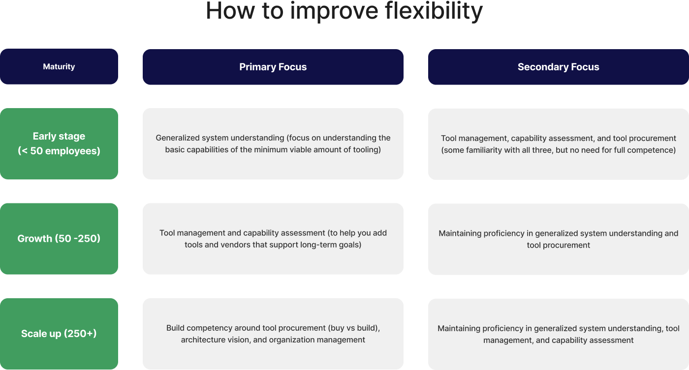 无论你的成熟阶段如何,你都需要在你的技术栈中做出权衡,以平衡你的即时需求和未来的技术债务。不要试图从一开始就成为所有工具领域的专家。相反,专注于几个主要领域,并在其他领域达到足够好的水平,直到需要它们为止。